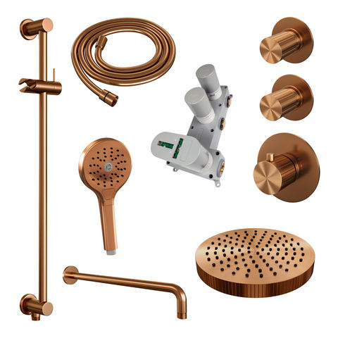 Brauer Stripe thermostatische inbouw regendouche SET 11 met 25 cm douchekop en gebogen muurarm en 3-standen handdouche en doucheslang en geïntegreerde glijstang koper geborsteld PVD | Geborsteld koper PVD | Ja | Gebogen wandarm | 3-standen handdouche