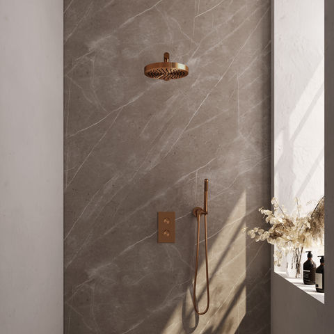 De doucheset is uitgevoerd in geborsteld koper met een PVD-coating. Dit zorgt ervoor dat de matte koperlook langdurig mooi blijft en minder gevoelig is voor krassen. Het materiaal van de set is messing, wat bekendstaat om zijn stevigheid en duurzaamheid. De set bestaat uit een rechthoekige inbouwthermostaat, een hoofddouche van 25 cm met een rechte muurarm, een staafhanddouche, een flexibele doucheslang en een wandaansluitbocht. Je kunt de temperatuur constant houden dankzij de thermostaat. De set is direct klaar voor installatie, omdat het inbouwdeel al is inbegrepen. Houd er rekening mee dat deze doucheset niet voorzien is van verschillende straalsoorten en dat je de handdouche niet aan een glijstang kunt ophangen. Naast deze koperkleur is de set ook verkrijgbaar in chroom, geborsteld goud PVD, geborsteld gunmetal PVD, geborsteld RVS PVD en mat zwart.