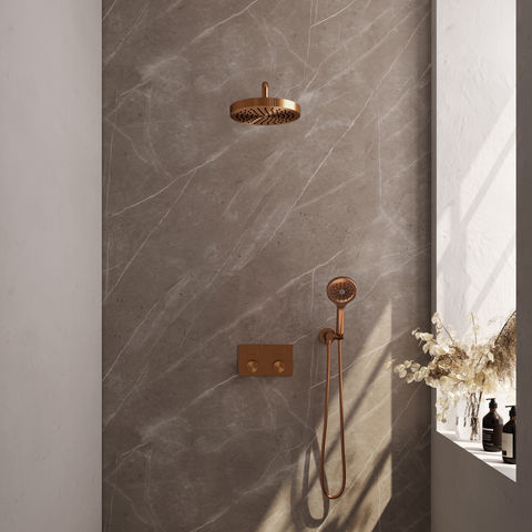 Deze doucheset is uitgevoerd in geborsteld koper PVD, wat zorgt voor een matte koperlook die dankzij de PVD-coating langdurig mooi en krasvast blijft. Het materiaal van de set is messing, wat bekend staat om zijn duurzaamheid. Je krijgt een hoofddouche van 25 cm met een gebogen muurarm, een handdouche met drie straalsoorten, een flexibele doucheslang en een wandaansluitbocht. De thermostaat zorgt voor een constante watertemperatuur tijdens het douchen. Het inbouwdeel wordt meegeleverd, wat de montage overzichtelijk maakt. De set is verkrijgbaar in meerdere afwerkingen: chroom, geborsteld goud PVD, geborsteld gunmetal PVD, geborsteld koper PVD, geborsteld RVS PVD en mat zwart. Je wisselt eenvoudig tussen de verschillende functies met de drukknoppen.