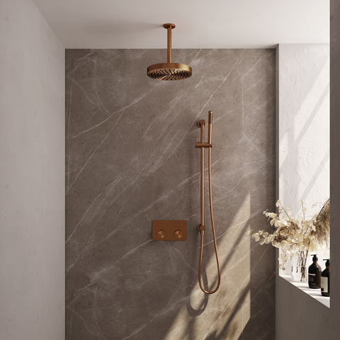 Offerte aanvraag voor Brauer Stripe thermostatische inbouw regendouche met drukknoppen SET 33 met 25 cm douchekop en plafondarm en staaf handdouche en doucheslang en geïntegreerde glijstang koper geborsteld PVD | Geborsteld koper PVD | Ja | Plafondbuis | Staafhanddouche