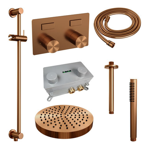 Brauer Stripe thermostatische inbouw regendouche met drukknoppen SET 33 met 25 cm douchekop en plafondarm en staaf handdouche en doucheslang en geïntegreerde glijstang koper geborsteld PVD | Geborsteld koper PVD | Ja | Plafondbuis | Staafhanddouche