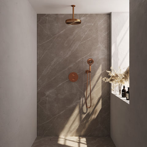Deze inbouw regendouche is een goede keuze als je je badkamer strak en opgeruimd wilt houden, en je het fijn vindt om te douchen onder een grote hoofddouche. De thermostaat maakt het prettig in gebruik, vooral als je een constante temperatuur belangrijk vindt. De set is minder geschikt als je meerdere wateruitgangen tegelijk wilt gebruiken, of als je graag een glijstang hebt om de handdouche op te hangen. Omdat het een inbouwset is, vraagt het wat meer voorbereiding bij installatie. Past goed in een moderne of industriële badkamer, zeker als je de koperkleur mooi vindt.