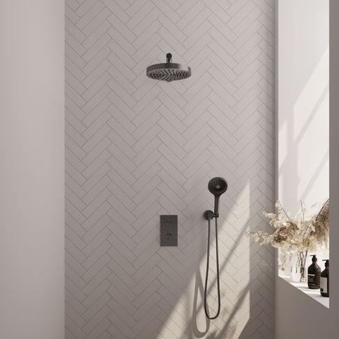 De set is gemaakt van duurzaam messing, wat zorgt voor stevigheid en een lange levensduur. De afwerking in gebrosteld gunmetal PVD geeft het geheel een moderne, matte uitstraling en biedt extra bescherming tegen krassen en verkleuring. Dankzij de thermostaat blijft de temperatuur van het water constant, wat prettig en veilig is tijdens het douchen. De handdouche heeft drie verschillende straalsoorten, die je eenvoudig met een druk op de knop kiest. De set is verkrijgbaar in meerdere kleuropties, waaronder chroom, geborsteld goud PVD, geborsteld koper PVD, geborsteld RVS PVD en mat zwart, zodat je de set kunt afstemmen op de rest van je badkamer.