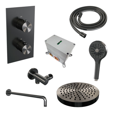 De set is gemaakt van messing, wat bekend staat als een stevig en duurzaam materiaal voor sanitair. De afwerking is geborsteld gunmetal PVD. PVD-coating zorgt voor een krasvaste en kleurvaste laag, wat handig is als je lang wilt genieten van de gekozen kleur. Naast deze uitvoering kun je de set ook krijgen in chroom, geborsteld goud PVD, geborsteld koper PVD, geborsteld RVS PVD en mat zwart. De thermostaat zorgt ervoor dat je de watertemperatuur constant houdt, wat prettig is tijdens het douchen. De handdouche biedt drie verschillende straalsoorten, die je met één druk op de knop kunt wisselen. Het inbouwdeel wordt meegeleverd, wat het installeren van de set overzichtelijker maakt.