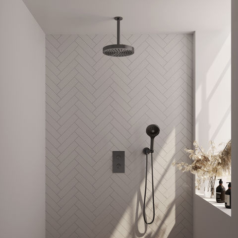 Deze doucheset is gemaakt van duurzaam messing, wat zorgt voor een stevige basis. De afwerking is geborsteld gunmetal PVD, een techniek die het oppervlak beschermt en het product een matte, stoere uitstraling geeft. De set bestaat uit een hoofddouche met plafondarm, een handdouche met drie standen, een flexibele doucheslang en een wandaansluitbocht. Je wisselt met één druk op de knop tussen de verschillende straalsoorten van de handdouche. Dankzij de thermostaat blijft de watertemperatuur constant tijdens het douchen. Het inbouwdeel wordt meegeleverd, wat de montage overzichtelijker maakt. Deze Brauer Stripe set is verkrijgbaar in meerdere afwerkingen, zoals chroom, geborsteld goud PVD, geborsteld koper PVD, geborsteld RVS PVD en mat zwart, zodat je kunt kiezen wat het beste bij jouw badkamer past.