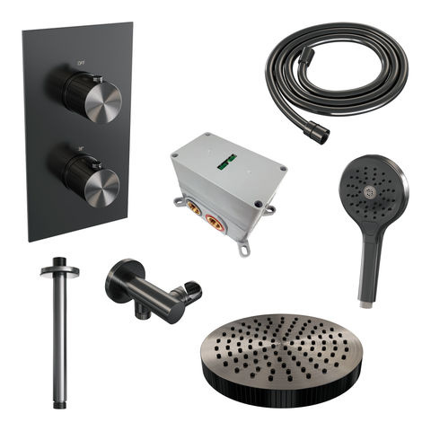 Brauer Stripe thermostatische inbouw regendouche 3-weg rechthoekig SET 18 met 25 cm douchekop en plafondarm en 3-standen handdouche en doucheslang en wandaansluitbocht gunmetal geborsteld PVD | Geborsteld gunmetal PVD | Nee | Plafondbuis | 3-standen handd