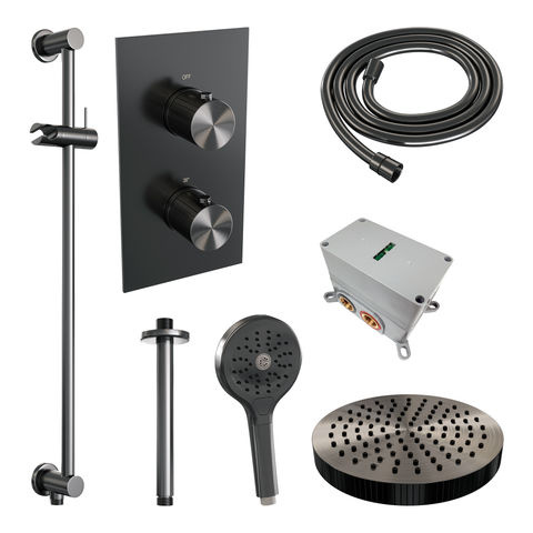 Brauer Stripe thermostatische inbouw regendouche 3-weg rechthoekig SET 24 met 25 cm douchekop en plafondarm en 3-standen handdouche en doucheslang en geïntegreerde glijstang gunmetal geborsteld PVD | Geborsteld gunmetal PVD | Ja | Plafondbuis | 3-standen