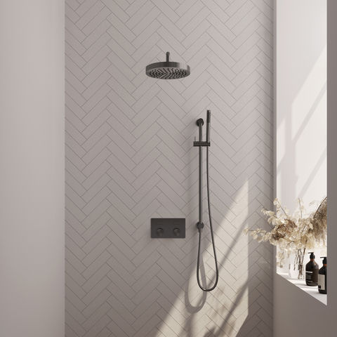 Deze set is gemaakt van duurzaam messing, wat zorgt voor stevigheid en een lange levensduur. De afwerking is geborsteld gunmetal PVD, een techniek waarbij een dunne, harde laag op het oppervlak wordt aangebracht. Dit maakt het materiaal beter bestand tegen krassen en verkleuring. De set is voorzien van een betrouwbare thermostaat die zorgt voor een constante watertemperatuur. Je bedient de douche eenvoudig via drukknoppen, waarmee je snel tussen de hoofddouche en handdouche wisselt of beide tegelijk gebruikt. De set wordt compleet geleverd met een doucheslang, handdouche en een geïntegreerde glijstang. Er zijn meerdere kleuropties beschikbaar, waaronder chroom, geborsteld goud PVD, geborsteld koper PVD, geborsteld RVS PVD en mat zwart.
