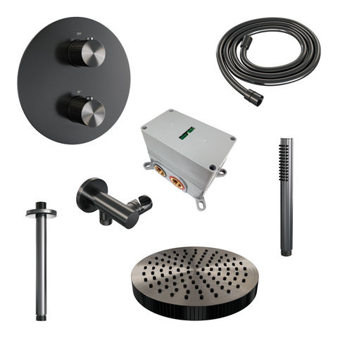 Brauer Stripe thermostatische inbouw regendouche 3-weg rond SET 39 met 25 cm douchekop en plafondarm en staaf handdouche en doucheslang en wandaansluitbocht gunmetal geborsteld PVD | Geborsteld gunmetal PVD | Nee | Plafondbuis | Staafhanddouche