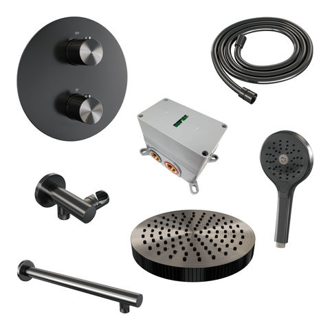 Brauer Stripe thermostatische inbouw regendouche 3-weg rond SET 40 met 25 cm douchekop en rechte muurarm en 3-standen handdouche en doucheslang en wandaansluitbocht gunmetal geborsteld PVD | Geborsteld gunmetal PVD | Nee | Rechte wandarm | 3-standen handd