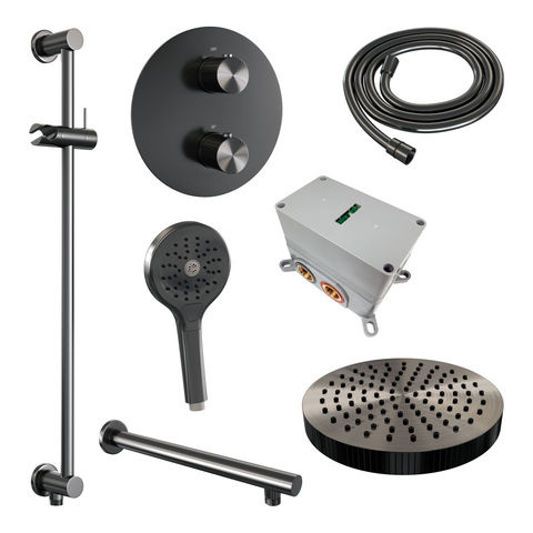 De set bestaat uit een ronde hoofddouche van 25 cm, een rechte muurarm, een handdouche met drie standen, een flexibele doucheslang en een geïntegreerde glijstang. Alles is uitgevoerd in geborsteld gunmetal PVD, een afwerking die bekend staat om zijn krasbestendigheid en moderne uitstraling. Het materiaal van de set is messing, wat bijdraagt aan de stevigheid. De thermostaat zorgt ervoor dat de watertemperatuur constant blijft tijdens het douchen. Het inbouwdeel is inbegrepen, waardoor je direct aan de slag kunt met de montage. Je kunt deze set ook krijgen in andere afwerkingen zoals chroom, geborsteld goud PVD, geborsteld koper PVD, geborsteld RVS PVD en mat zwart, zodat je de kleur kunt kiezen die het beste bij jouw badkamer past.