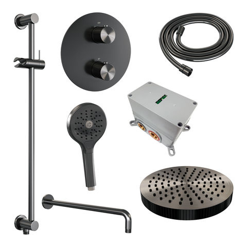 De set bestaat uit een ronde hoofddouche van 25 cm, een gebogen muurarm, een handdouche met drie standen, een flexibele doucheslang en een geïntegreerde glijstang. Het geheel is uitgevoerd in geborsteld gunmetal PVD, wat zorgt voor een matte, donkere uitstraling. De PVD-coating biedt extra bescherming tegen krassen en slijtage. Het materiaal is messing, wat bekend staat om zijn stevigheid. De handdouche heeft drie verschillende straalsoorten, die je met één druk op de knop kunt wisselen. Dankzij de glijstang kun je de handdouche makkelijk in hoogte verstellen. De set is verkrijgbaar in meerdere afwerkingen, zoals chroom, geborsteld goud PVD, geborsteld koper PVD, geborsteld RVS PVD en mat zwart, zodat je kunt kiezen wat het beste bij jouw badkamer past.