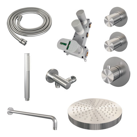 Brauer Stripe thermostatische inbouw regendouche SET 02 met 25 cm douchekop en gebogen muurarm en staaf handdouche en doucheslang en wandaansluitbocht RVS-kleurig geborsteld PVD | Geborsteld RVS | Nee | Gebogen wandarm | Staafhanddouche
