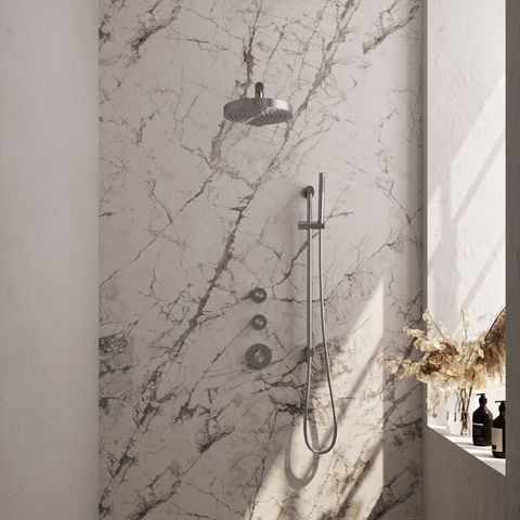 Deze Brauer Stripe inbouw regendoucheset is bedoeld voor wie op zoek is naar een complete en praktische oplossing voor de douche. Je krijgt een set met een grote, 25 cm brede hoofddouche, een rechte muurarm, een handdouche met doucheslang en een geïntegreerde glijstang. De thermostaat zorgt ervoor dat je altijd een constante temperatuur hebt tijdens het douchen. Dit is een goede keuze als je het fijn vindt om zowel een regendouche als een handdouche te gebruiken, en je graag een strakke, inbouwoplossing wilt in je badkamer.