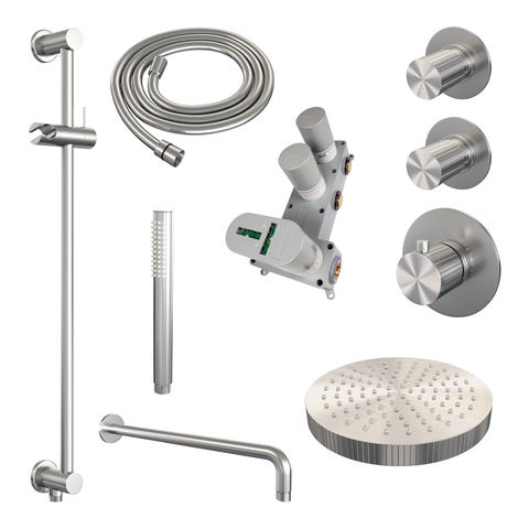 Brauer Stripe thermostatische inbouw regendouche SET 08 met 25 cm douchekop en gebogen muurarm en staaf handdouche en doucheslang en geïntegreerde glijstang RVS-kleurig geborsteld PVD | Geborsteld RVS | Ja | Gebogen wandarm | Staafhanddouche