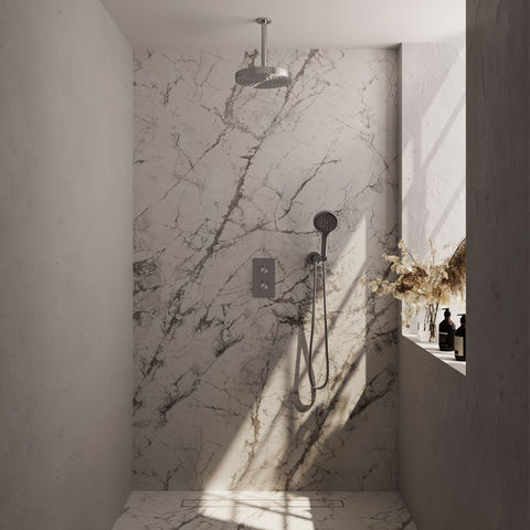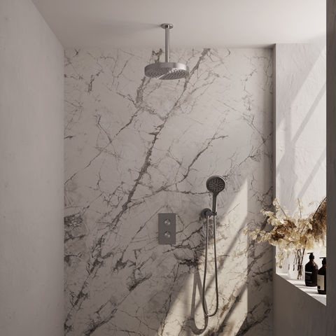 Deze inbouw regendoucheset is een goede keuze als je een moderne, minimalistische uitstraling wilt en bereid bent om inbouwwerk te laten doen. De set is geschikt voor badkamers waar je geen glijstang nodig hebt, want deze wordt niet meegeleverd. Houd er rekening mee dat je niet meerdere wateruitgangen tegelijk kunt gebruiken: je kiest dus steeds tussen de hoofddouche of de handdouche. Heb je beperkte ruimte of wil je liever alles op de muur monteren, dan is een opbouwset misschien praktischer. Voor een strak en compleet geheel in een nieuwe of gerenoveerde badkamer is deze set juist heel geschikt.