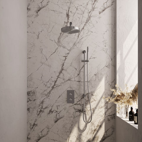 De set is vervaardigd uit messing, een materiaal dat bekend staat om zijn stevigheid en bestendigheid. De afwerking is RVS-kleurig geborsteld PVD, wat zorgt voor een matte, moderne uitstraling en extra bescherming tegen slijtage. De thermostaatkraan zorgt ervoor dat de watertemperatuur constant blijft, wat prettig is als je niet van temperatuurschommelingen houdt. Je bedient de set via de rechthoekige inbouwkraan en kunt kiezen tussen de hoofddouche en de handdouche. Houd er rekening mee dat je niet meerdere wateruitgangen tegelijk kunt gebruiken. Deze set is verkrijgbaar in verschillende afwerkingen: Chroom, Geborsteld goud PVD, Geborsteld gunmetal PVD, Geborsteld koper PVD, Geborsteld RVS PVD en Mat zwart. Zo kun je de set afstemmen op jouw badkamerstijl.