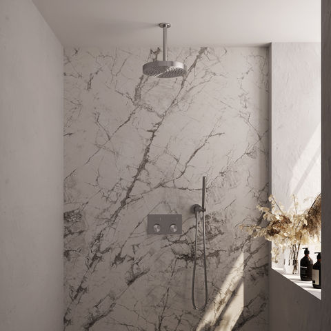 De set is vervaardigd uit kwalitatief messing en heeft een PVD-coating in geborsteld RVS, wat zorgt voor een duurzame afwerking. De bediening werkt via drukknoppen, wat het gebruik intuïtief en modern maakt. Je kunt de hoofddouche en de handdouche zelfs gelijktijdig gebruiken, wat handig is als je meer flexibiliteit wilt. De thermostaat zorgt ervoor dat de watertemperatuur constant blijft, wat prettig is voor dagelijks gebruik. Het inbouwdeel wordt meegeleverd, zodat alle benodigde techniek netjes achter de muur weggewerkt wordt. Deze doucheset is verkrijgbaar in meerdere afwerkingen, waaronder chroom, geborsteld goud PVD, geborsteld gunmetal PVD, geborsteld koper PVD, geborsteld RVS PVD en mat zwart. Let op: de set heeft geen verschillende straalsoorten en wordt geleverd zonder glijstang voor de handdouche.