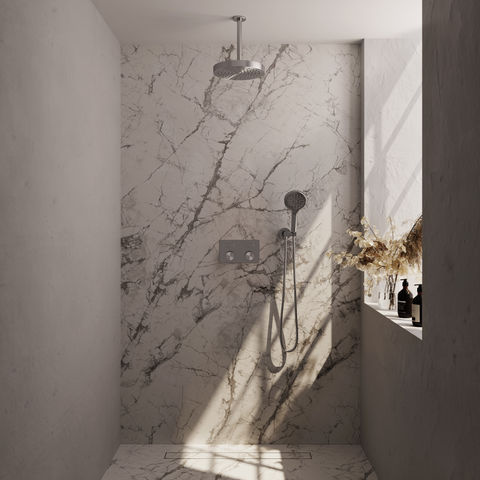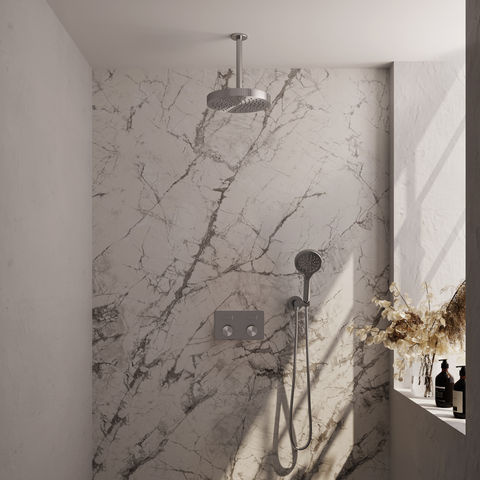 De set is vervaardigd uit duurzaam messing en afgewerkt met een PVD-coating in geborsteld RVS, wat zorgt voor een krasbestendig en kleurvast oppervlak. De thermostatische kraan houdt de watertemperatuur constant, wat prettig is als je met meerdere personen doucht of als de waterdruk wisselt. De bediening verloopt via drukknoppen waarmee je eenvoudig wisselt tussen de hoofddouche en handdouche, of beide tegelijk gebruikt. De handdouche biedt drie verschillende straalsoorten, zodat je zelf kiest wat prettig voelt. Het inbouwdeel wordt standaard meegeleverd. Deze set is verkrijgbaar in meerdere afwerkingen: chroom, geborsteld goud PVD, geborsteld gunmetal PVD, geborsteld koper PVD, geborsteld RVS PVD en mat zwart.