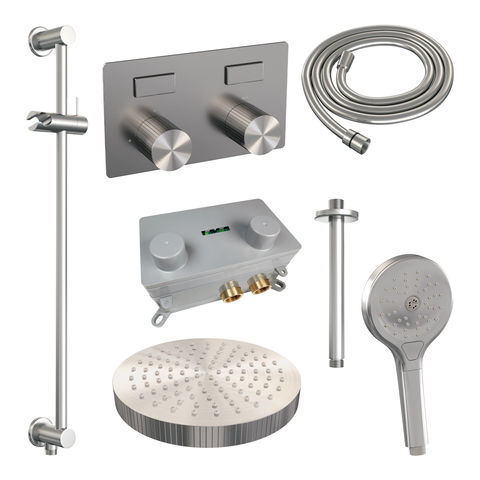 Brauer Stripe thermostatische inbouw regendouche met drukknoppen SET 36 met 25 cm douchekop en plafondarm en 3-standen handdouche en doucheslang en geïntegreerde glijstang RVS-kleurig geborsteld PVD | Geborsteld RVS | Ja | Plafondbuis | 3-standen handdouc