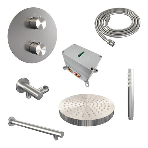 Brauer Stripe thermostatische inbouw regendouche 3-weg rond SET 37 met 25 cm douchekop en rechte muurarm en staaf handdouche en doucheslang en wandaansluitbocht RVS-kleurig geborsteld PVD | Geborsteld RVS | Nee | Rechte wandarm | Staafhanddouche
