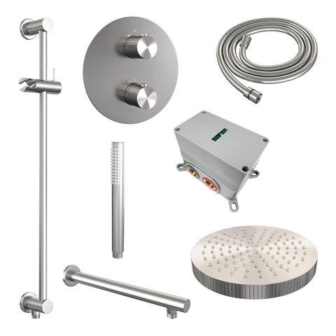 Deze doucheset is gemaakt van duurzaam messing en afgewerkt met een PVD-coating in geborsteld RVS. PVD staat voor Physical Vapor Deposition, een techniek die zorgt voor een sterke, krasbestendige en kleurvaste afwerking. De set bestaat uit een 25 cm ronde hoofddouche, een rechte muurarm, een staaf handdouche, een flexibele doucheslang en een geïntegreerde glijstang. De bediening verloopt via een thermostaatkraan, waarmee je eenvoudig een constante watertemperatuur instelt. Het inbouwdeel wordt meegeleverd, waardoor alles netjes in de muur weggewerkt kan worden. Deze set is verkrijgbaar in meerdere afwerkingen: chroom, geborsteld goud PVD, geborsteld gunmetal PVD, geborsteld koper PVD, geborsteld RVS PVD en mat zwart.