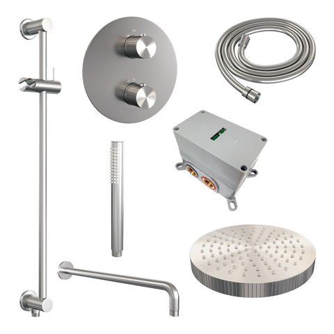 Brauer Stripe thermostatische inbouw regendouche 3-weg rond SET 44 met 25 cm douchekop en gebogen muurarm en staaf handdouche en doucheslang en geïntegreerde glijstang RVS-kleurig geborsteld PVD | Geborsteld RVS | Ja | Gebogen wandarm | Staafhanddouche
