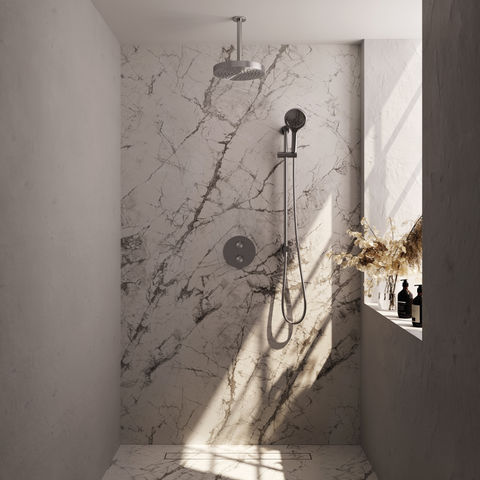 Deze inbouw regendouche is handig als je een nieuwe badkamer aanlegt of een grondige renovatie doet, omdat het inbouwdeel in de muur verwerkt wordt. Dat zorgt voor een strak geheel en meer ruimte in de douche. De set is minder praktisch als je bestaande leidingen niet wilt aanpassen of als je meerdere wateruitgangen tegelijk wilt gebruiken, want dat is bij dit model niet mogelijk. Als je flexibiliteit en een moderne uitstraling zoekt, en je vindt het prettig om te kunnen kiezen tussen verschillende straalsoorten, dan is deze set een goede keuze.