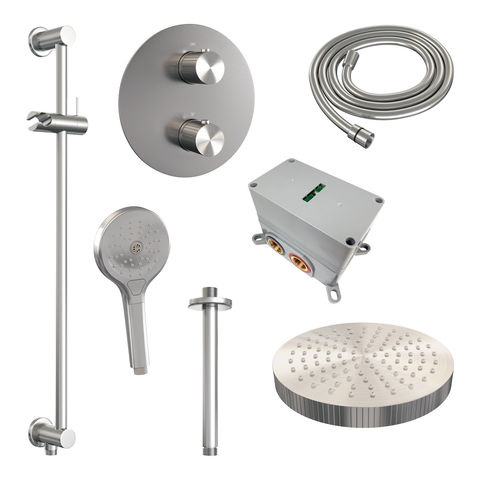 Brauer Stripe thermostatische inbouw regendouche 3-weg rond SET 48 met 25 cm douchekop en plafondarm en 3-standen handdouche en doucheslang en geïntegreerde glijstang RVS-kleurig geborsteld PVD | Geborsteld RVS | Ja | Plafondbuis | 3-standen handdouche