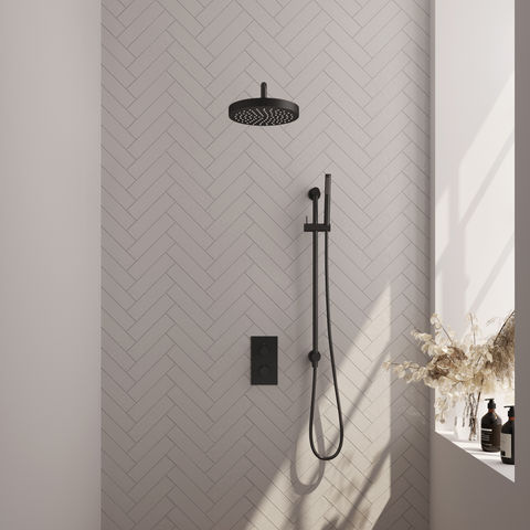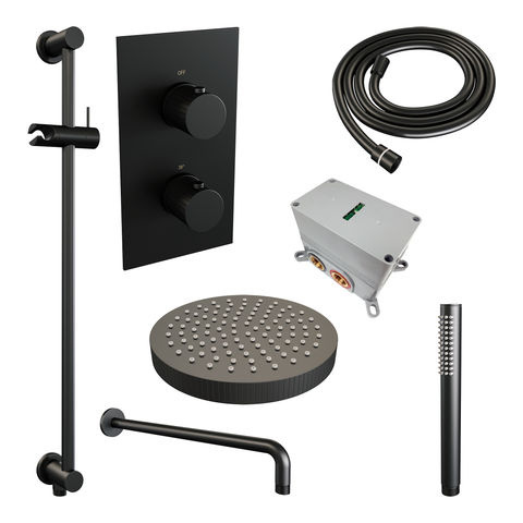 De set is uitgevoerd in een mat zwarte afwerking, wat zorgt voor een moderne uitstraling. Het materiaal is duurzaam messing, wat bekend staat om zijn stevigheid en bestendigheid tegen vocht. De thermostaat zorgt ervoor dat je de watertemperatuur constant kunt houden tijdens het douchen. Met de 3-weg omstelling kun je eenvoudig wisselen tussen de hoofddouche, handdouche en een derde functie, maar het is niet mogelijk om meerdere wateruitgangen tegelijk te gebruiken. De hoofddouche heeft een doorsnee van 25 cm en de handdouche is voorzien van een flexibele slang en verstelbare glijstang. Deze doucheset is verkrijgbaar in meerdere afwerkingen: chroom, geborsteld goud PVD, geborsteld gunmetal PVD, geborsteld koper PVD, geborsteld RVS PVD en mat zwart.