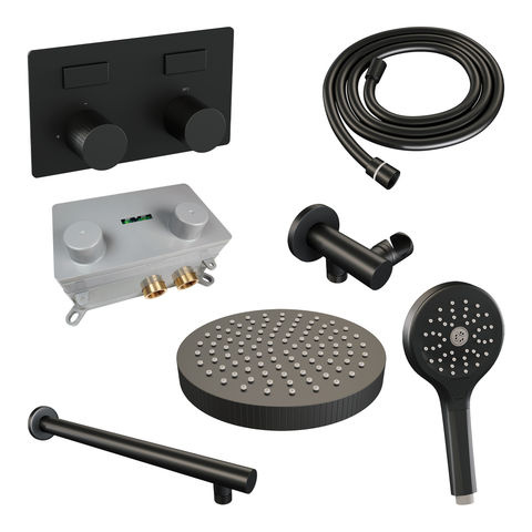 Brauer Stripe thermostatische inbouw regendouche met drukknoppen SET 28 met 25 cm douchekop en rechte muurarm en 3-standen handdouche en doucheslang en wandaansluitbocht mat zwart | Mat zwart | Nee | Rechte wandarm | 3-standen handdouche