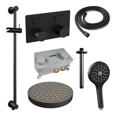 Brauer Stripe thermostatische inbouw regendouche met drukknoppen SET 36 met 25 cm douchekop en plafondarm en 3-standen handdouche en doucheslang en geïntegreerde glijstang mat zwart | Mat zwart | Ja | Plafondbuis | 3-standen handdouche