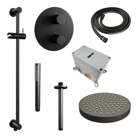 Brauer Stripe thermostatische inbouw regendouche 3-weg rond SET 45 met 25 cm douchekop en plafondarm en staaf handdouche en doucheslang en geïntegreerde glijstang mat zwart | Mat zwart | Ja | Plafondbuis | Staafhanddouche