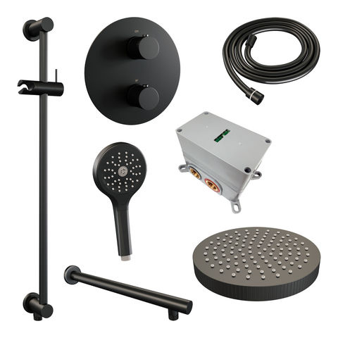 Brauer Stripe thermostatische inbouw regendouche 3-weg rond SET 46 met 25 cm douchekop en rechte muurarm en 3-standen handdouche en doucheslang en geïntegreerde glijstang mat zwart | Mat zwart | Ja | Rechte wandarm | 3-standen handdouche