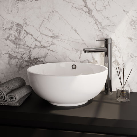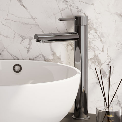 Deze verhoogde opbouwkraan is vooral geschikt als je een opzetwastafel hebt of wilt plaatsen. Door de hoogte heb je voldoende ruimte om je handen te wassen of een glas te vullen. Houd er rekening mee dat de uitloop niet draaibaar is, wat minder praktisch kan zijn als je veel flexibiliteit wilt. In een kleinere badkamer of bij een lage wastafel kan de hoogte van de kraan minder handig zijn. Kies je voor een strak en functioneel ontwerp dat in veel badkamers past, dan is dit een goede optie.