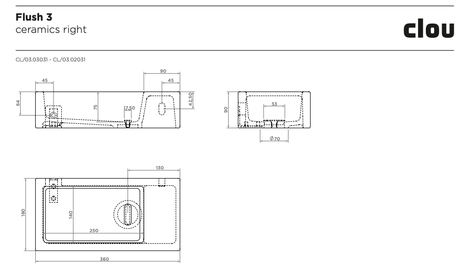 Met een afmeting van 36 cm en een handige plaatsing aan de rechterkant past deze fontein perfect in hoeken of kleine ruimtes. Het randloze ontwerp zorgt voor een moderne uitstraling en maakt het eenvoudig om deze te combineren met andere producten uit de Clou-serie. Laat je verrassen door de mogelijkheden die deze kleine wastafel biedt!
