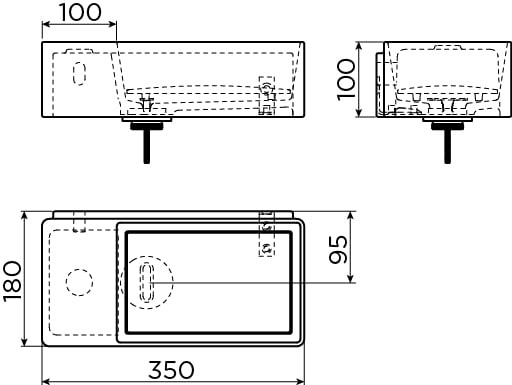 Clou New Flush 3 fontein, links, Mat wit, met voorbewerkt kraangat en afvoerset. Met een vlakke afvoerplaat. Wanddikte van 5mm. 35x18x10 (bxdxh)