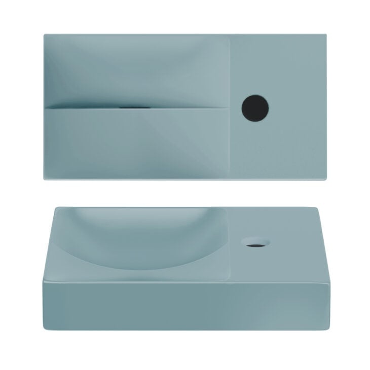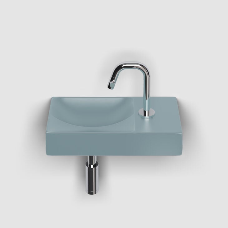 Ontdek de Clou Vale fontein, een stijlvolle en compacte kleine wastafel die perfect in elke badkamer past. Met zijn unieke mat blauwe keramiek en praktische kraangat aan de rechterkant, is deze hoekfontein niet alleen een blikvanger, maar ook bijzonder functioneel.