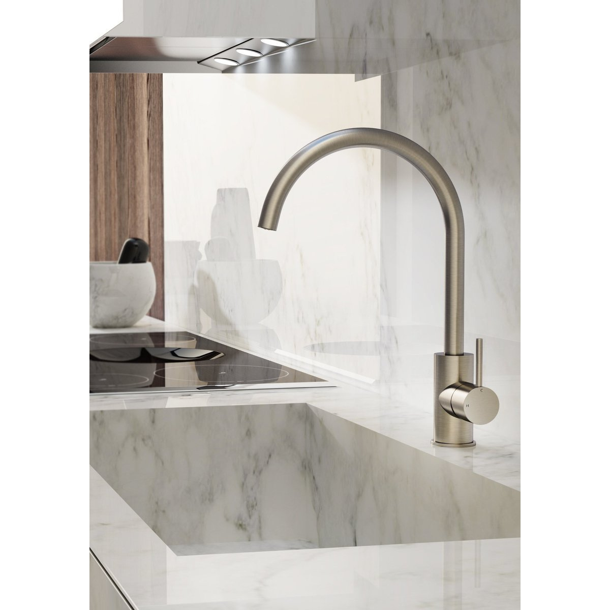 De keukenmengkraan is gemaakt van hoogwaardig messing en is voorzien van een PVD-coating, waardoor de kleur een mooie glans en uitstraling krijgt. De PVD-coating maakt de kraan ook bestendiger tegen krassen, waardoor hij er langer als nieuw uit blijft zien. Met zijn opbouwmontage is deze kraan eenvoudig te installeren in uw keuken.