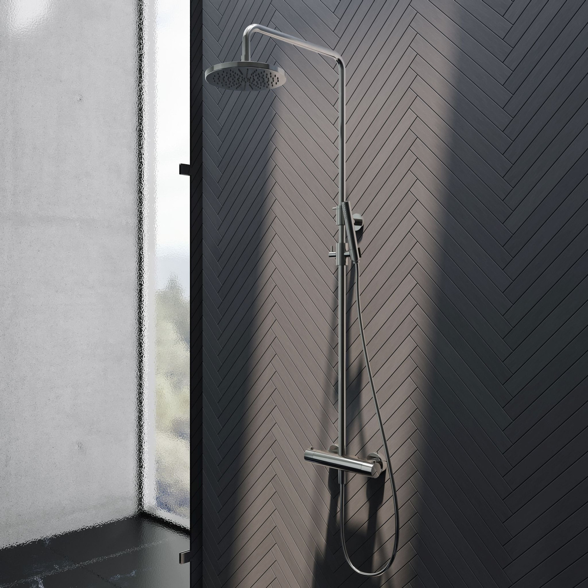 De Hotbath Get together SDS1 opbouw regendoucheset is een complete thermostatische stortdoucheset uit de 'Buddy' serie. Met zijn moderne en stoere uitstraling brengt deze regendoucheset een eigentijds design in je badkamer. De set is verkrijgbaar in de Chroom finish, waardoor het perfect past bij elke badkamerstijl.