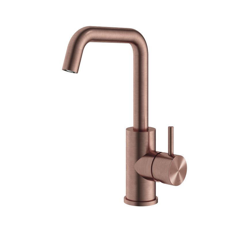 De prachtige Geborsteld Koper PVD afwerking van deze wastafelmengkraan zal ongetwijfeld de aandacht trekken. Maar het is niet alleen de uitstraling die indruk maakt; de draaibare uitloop biedt ook functionaliteit.