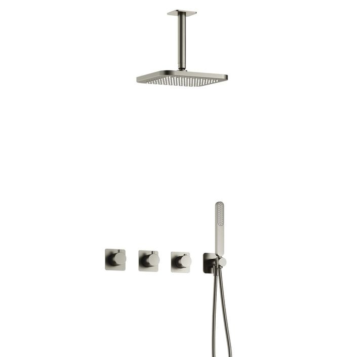 Met deze inbouwset krijg je een complete oplossing. De set bevat een ruime hoofddouche van 22 cm die je via een plafondbuis kunt monteren, een praktische handdouche en een 150 cm lange doucheslang voor flexibel gebruik. Dankzij de thermostatische bediening geniet je altijd van een stabiele watertemperatuur.