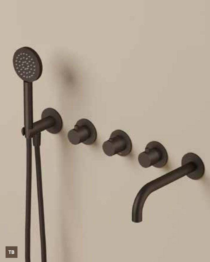 De kraan is uitgevoerd in een elegante Tuscan bronze kleur met een matte afwerking, wat naadloos past in zowel moderne als tijdloze badkamerstijlen. Met de twee stopkranen kun je eenvoudig twee wateruitgangen tegelijk bedienen, ideaal voor het gebruik van zowel de baduitloop als de meegeleverde handdouche en doucheslang.