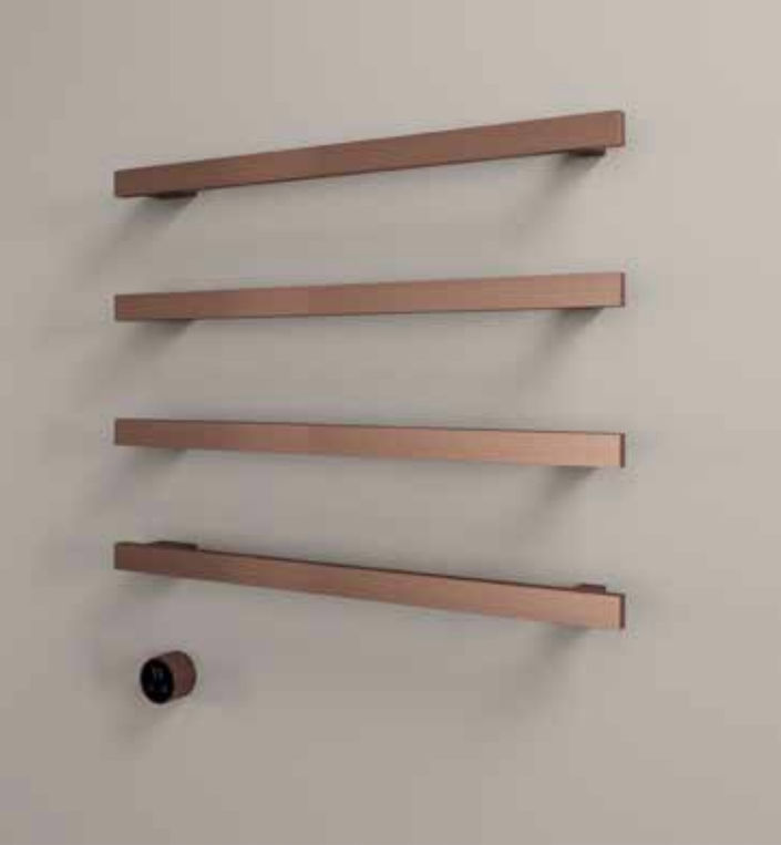 Maak van uw badkamer een luxueus toevluchtsoord met de Hotbath &More Rails Square handdoekwarmerset. Deze stijlvolle, elektrische radiator combineert functionaliteit met een verfijnde esthetiek dankzij de geborsteld messing PVD afwerking. De warme, gouden tint en de matte uitstraling geven uw badkamer een elegant accent, terwijl de hoogwaardige RVS-constructie duurzaamheid garandeert.