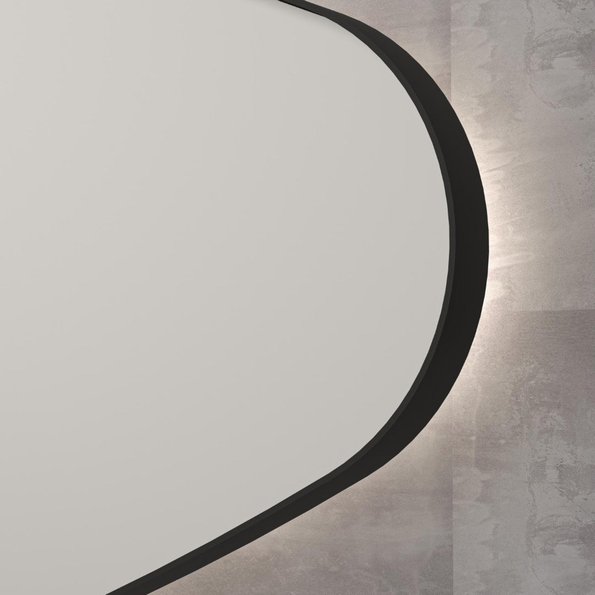 De spiegel heeft een organische vorm die zorgt voor een unieke uitstraling in je badkamer. Het stalen kader aan de zijkant geeft de spiegel een stevige basis en zorgt ervoor dat hij mooi op zijn plek blijft hangen. Het aluminium frame aan de rechterkant heeft een mat zwarte afwerking, waardoor de spiegel een stoere uitstraling heeft.
