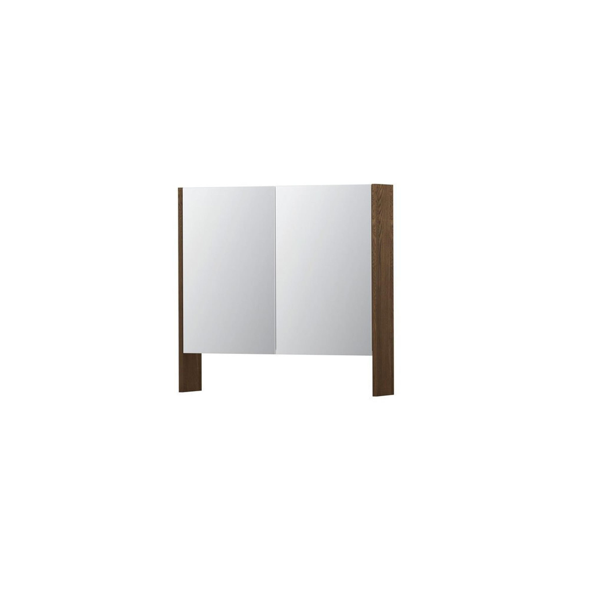 INK SPK3 Spiegelkast - 80x14x74cm - 2 deuren - dubbelzijdige Spiegel - open planchet - schakelaar en stopcontact - Massief Eiken - eiken chocolate