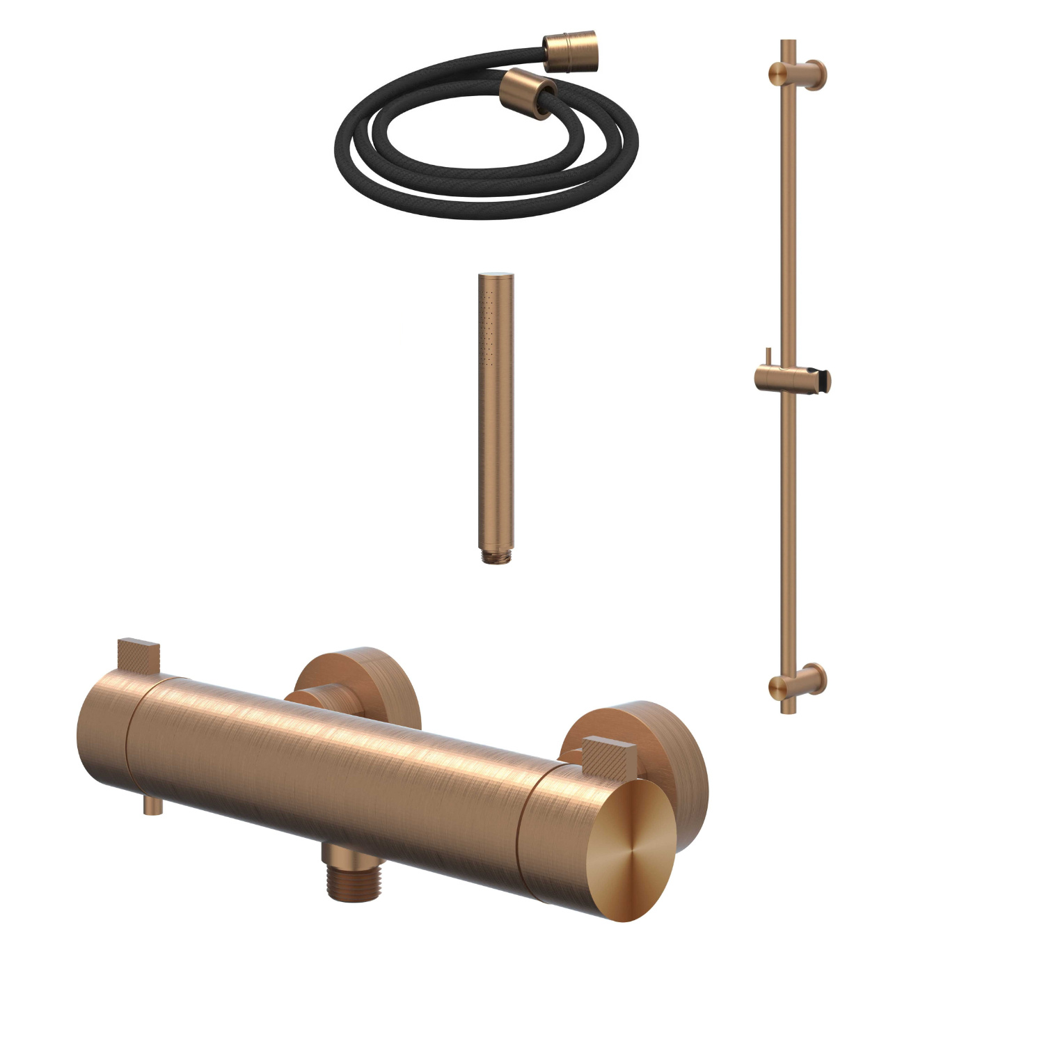 De IVY Tribe glijstangset in Geborsteld Mat Koper PVD straalt een moderne en luxueuze uitstraling uit, waardoor het een verfijnde toevoeging is aan elke badkamer. De combinatie van hoogwaardig RVS 316 en het Matte Koperen PVD-afwerking geeft een tijdloze elegantie aan de badkamer, waardoor een stijlvolle sfeer wordt gecreëerd.
