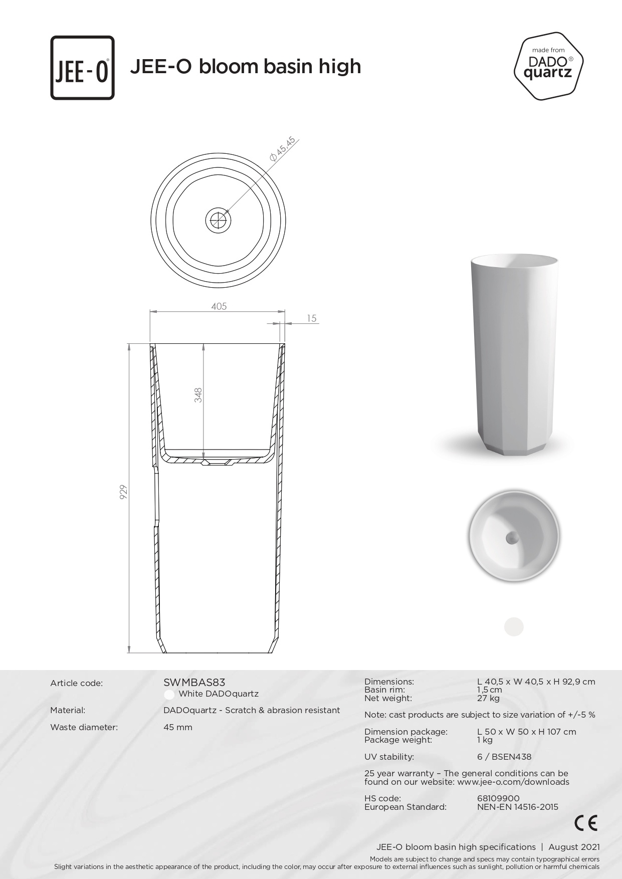 De JEE-O Bloom vrijstaande wastafel is eenvoudig te installeren en te onderhouden. Het hoogwaardige DADO Quartz materiaal is bestand tegen vlekken en krassen, waardoor de wastafel er langdurig mooi uit blijft zien. Daarnaast is het matte oppervlak gemakkelijk schoon te maken en te onderhouden.