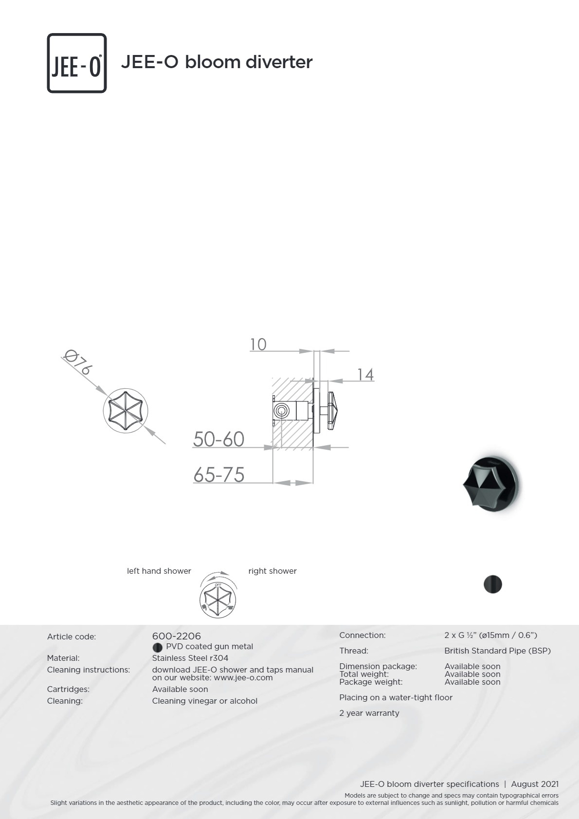 Met de JEE-O Bloom wand omsteller in gun metal kun je gemakkelijk de waterstroom van je douche regelen. De omsteller heeft een stoer en modern uiterlijk dankzij de gun metal kleur. De wand omsteller is onderdeel van de JEE-O Bloom collectie, waarin stoere en robuuste designs worden gecombineerd met de nieuwste technologieën.