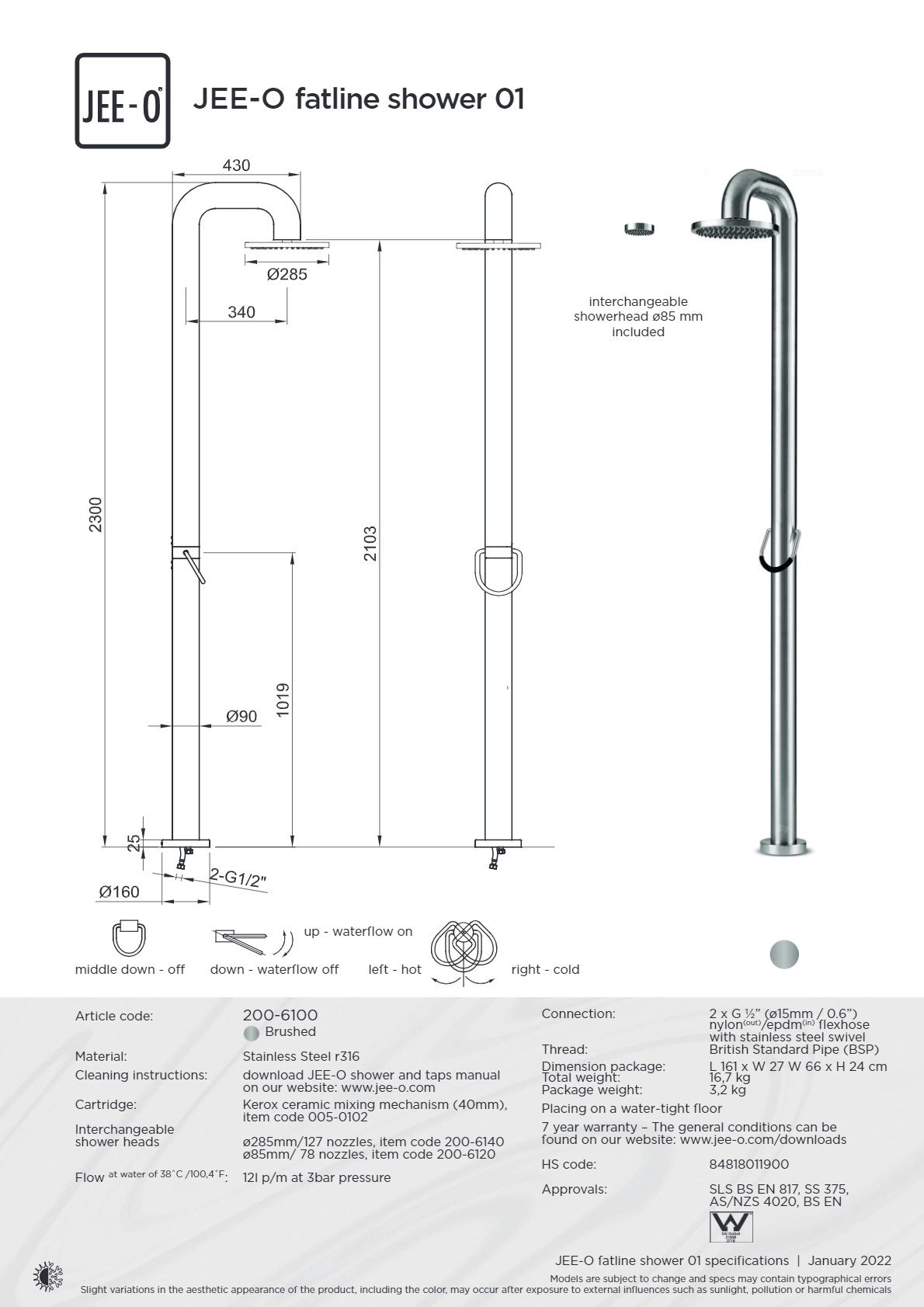 De JEE-O Fatline Vrijstaande douche heeft een nngreepsmengkraan, waarmee je eenvoudig de gewenste temperatuur en waterdruk kunt regelen. Daarnaast is deze douche voorzien van een handige handdouche, zodat je ook makkelijk kunt afspoelen of schoonmaken.